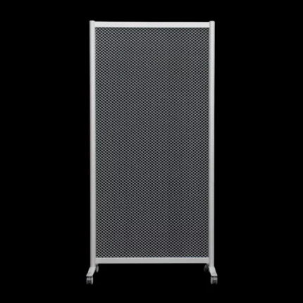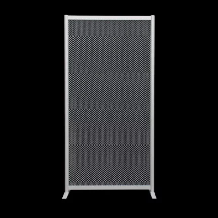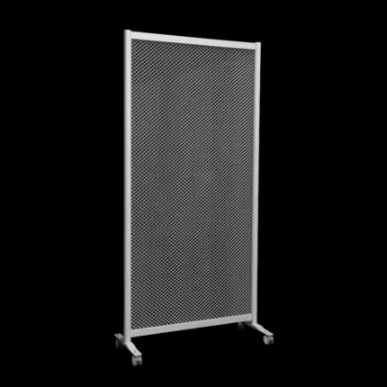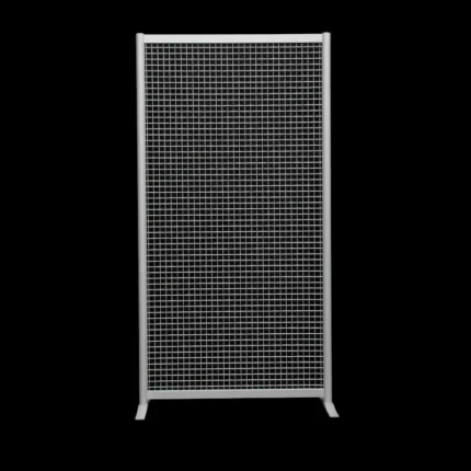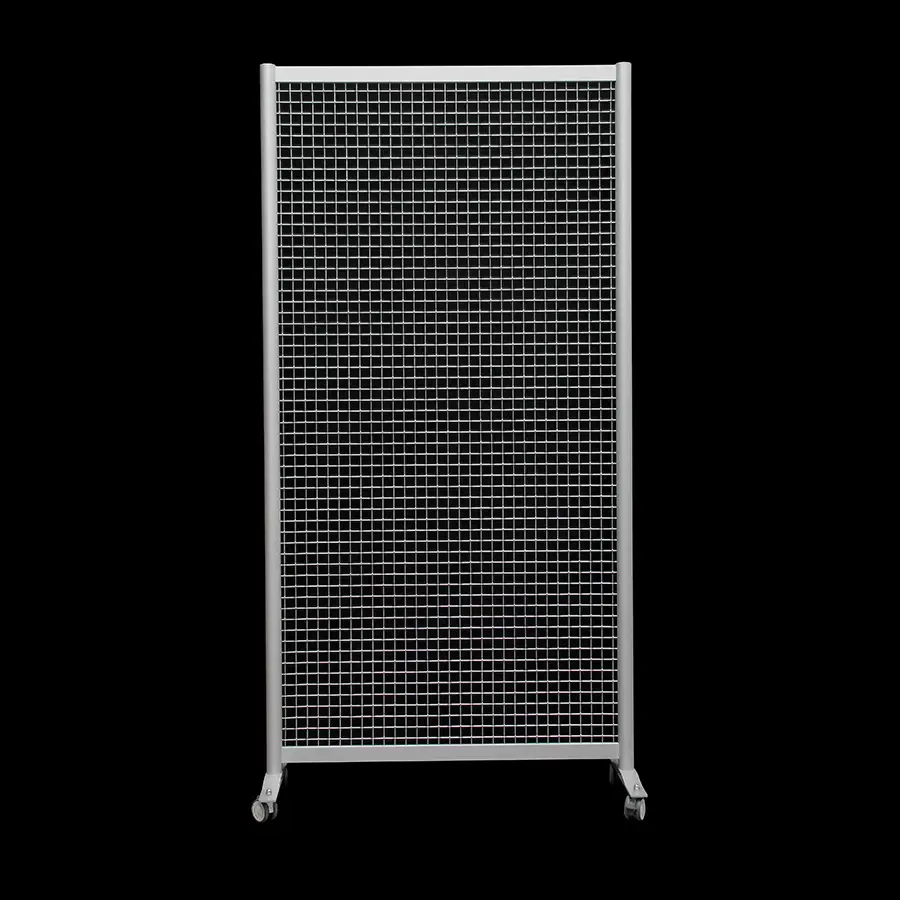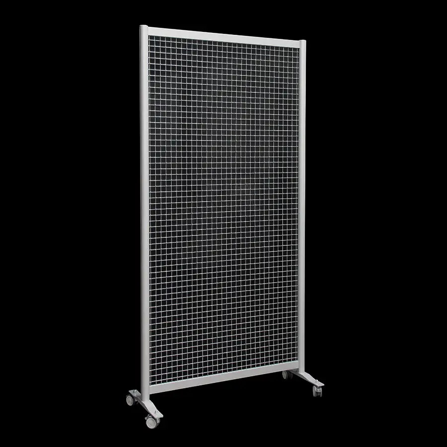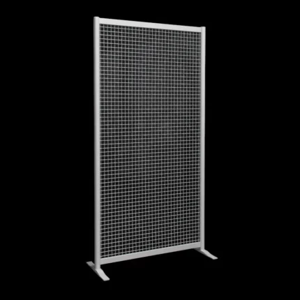Gaaswand HxB220x110cm 3×3 op wielen De modulaire gaaswanden zijn uitgevoerd in een aluminium frame met een gaas vulling (of andere vulling op aanvraag). Door gebruik van diverse accessoires kan de gaas wand gebruikt worden als expositiepaneel of als scheidingswand. De wanden zijn ook met 1 staander telkens doorkoppelbaar. Los geplaatst met 2 staanders koppelbaar, echter onze ervaring leert dat dit vanwege zijn sterkte en stabiliteit onnodig is. De wand is toepasbaar als afscheiding in kantoor, werkruimte of openbare ruimtes als school, ziekenhuis, gemeentehuis, beurs, evenement, open dag of tentoonstelling. Alle wanden, zowel op wielen of voeten zijn nestelbaar. Wanneer u de wanden niet gebruikt nemen ze gemonteerd nauwelijks ruimte in. Ook transport van compleet gemonteerde wanden blijft betaalbaar op deze manier.