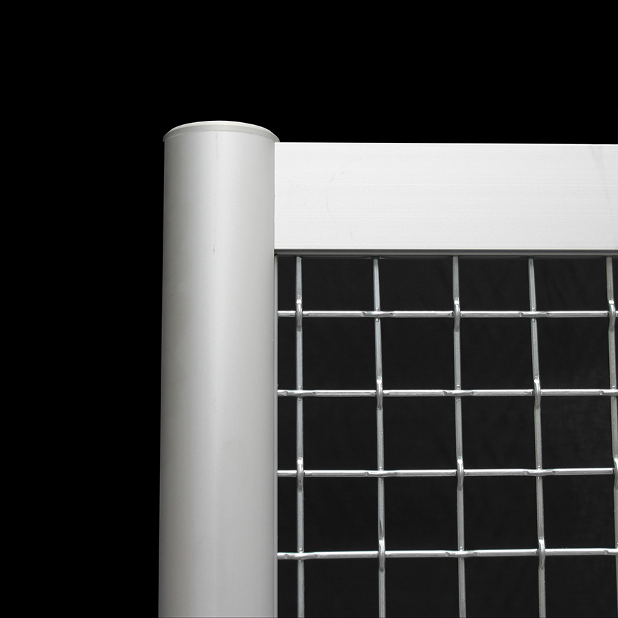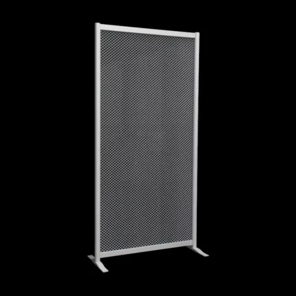 | Uitvoering | Aluminium geanodiseerd frame met staanders rond 5 cm. Gaas 3x3cm. Massief aluminium geanodiseerde dop. Slanke metalen aluminium kleur gecoate voet (L = 44 cm). Kunststof gelagerde wielen Ø6,5cm met rem. De wand wordt gemonteerd geleverd. |