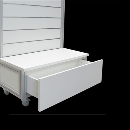 Middenmeubel slatwall wit HxB140x104cm met 2-zijdige ladenkast op wielen